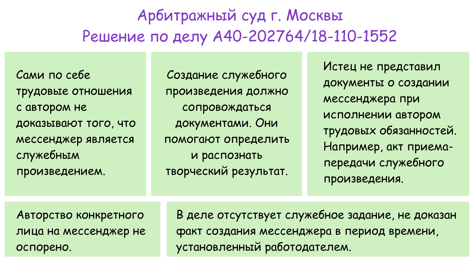 На выходе получила решение суда: в трудовых договорах, служебной переписке и других материалах нет доказательств того, что мессенджер является служебным произведением. Поэтому компания не имеет на него интеллектуальных прав.