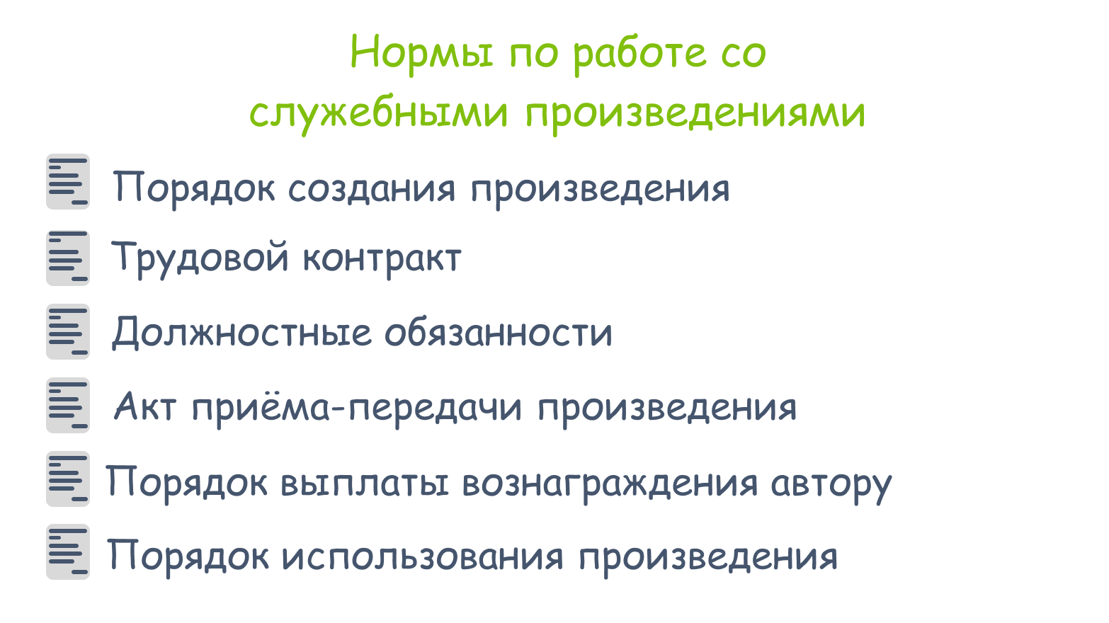 Любая работа преследует конкретную цель. Например, «Порядок создания и использования служебных произведений» вносит ясность в одноименную деятельность работодателя и работника.