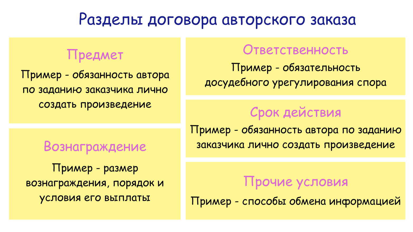 Например, в своих договорах авторского заказа я выделяю минимум пять базовых разделов.