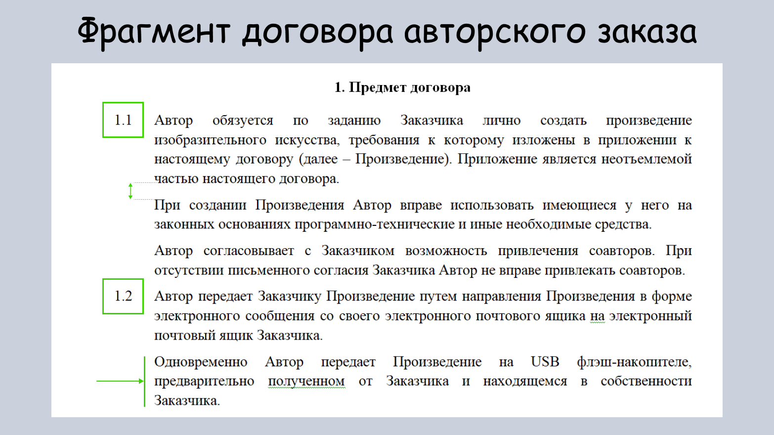 Например, одно из очевидных условий по договору авторского заказа – создание произведения автором лично.
